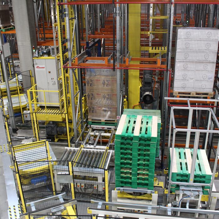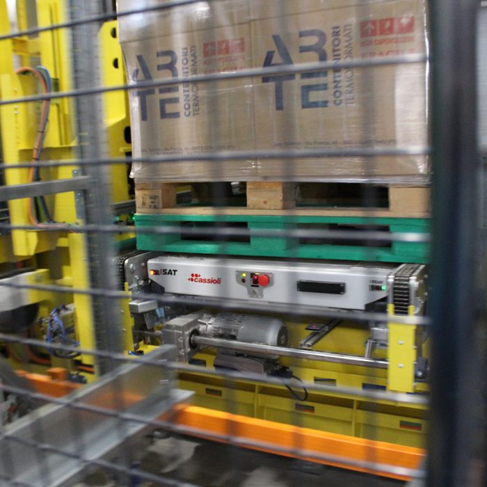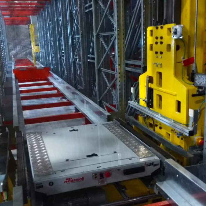 Almacén automático con transelevador ICRANE dedicado al almacenamiento de palets en estanterías de múltiple profundidad. El sistema ICRANE es el almacén automatizado de Cassioli diseñado específicamente para el almacenamiento de palets en estanterías de múltiple profundidad, gracias a la integración de pallet shuttle y transelevador. Las lanzaderas ISAT, tras ser transferidas a bordo de un transelevador en un canal de almacenamiento específico, recuperan o depositan la carga en función de la información recibida desde el sistema de gestión del almacén.ICRANE e ISAT pallet shuttle cuentan con una interfaz directa con el sistema de gestión y pueden integrarse con otros sistemas de manipulación automática como los vehículos AGV, vehículos guiados por rieles SLS o sistemas de manipulación tradicionales. La comunicación de datos con tecnología Wi-Fi permite que el sistema de control pueda comunicar tareas, realizar diagnósticos, conocer el estado de las baterías y realizar el monitoreo remoto.