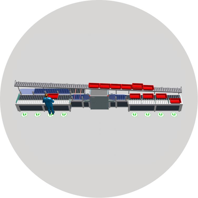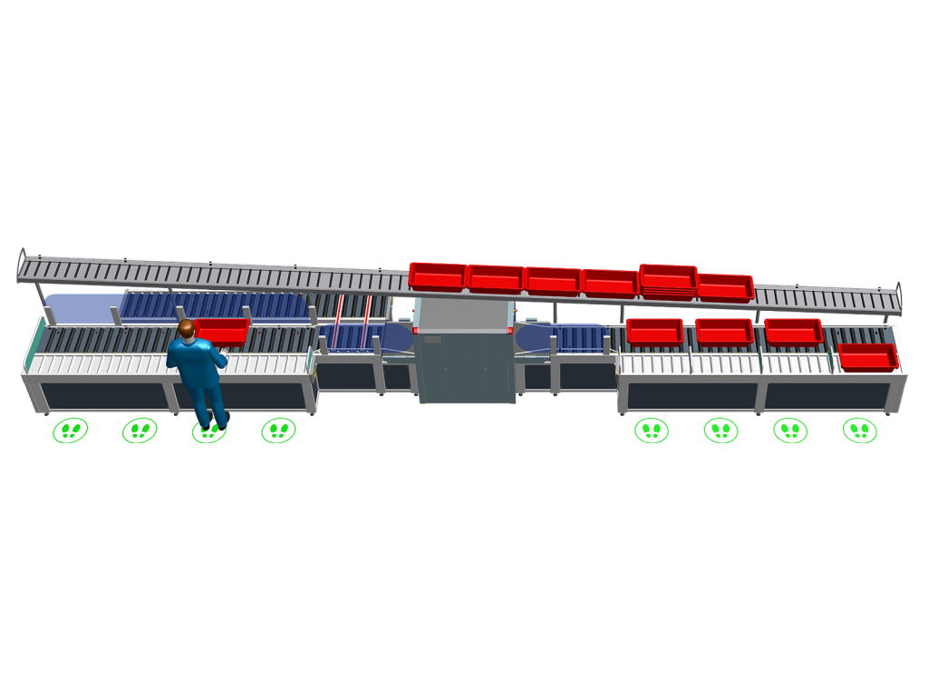 FAST2CHECK EASY PLUS es el modelo de puesto de control ideal para todos aquellos aeropuertos que necesitan acelerar los procedimientos de control de equipaje y necesitan también una gestión avanzada de los equipajes sospechosos pero tienen poco espacio. Al igual que el modelo EASY, FAST2CHECK EASY PLUS cuenta con el sistema Queue Beater en la parte inicial y la recirculación de las bandejas con la línea de retorno del transportador por gravedad. Además de lo antedicho, el modelo Plus también incluye una línea de clasificación especial dedicada al equipaje sospechoso en el aeropuerto. Tras salir de la inspección en la máquina de rayos X, las bandejas sospechosas se seleccionan y se envían a una línea paralela donde el operador podrá controlar meticulosamente el material señalado como sospechoso. Una vez inspeccionado el equipaje, las bandejas vacías volverán al punto de partida por medio de una línea de retorno elevada del transportador por gravedad. Cabe especificar que es posible configurar una cinta transportadora motorizada para el retorno de las bandejas incluso para una configuración de este tipo.