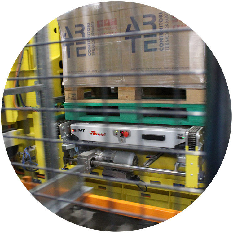 Almacén automático con transelevador ICRANE dedicado al almacenamiento de palets en estanterías de múltiple profundidad. El sistema ICRANE es el almacén automatizado de Cassioli diseñado específicamente para el almacenamiento de palets en estanterías de múltiple profundidad, gracias a la integración de pallet shuttle y transelevador. Las lanzaderas ISAT, tras ser transferidas a bordo de un transelevador en un canal de almacenamiento específico, recuperan o depositan la carga en función de la información recibida desde el sistema de gestión del almacén.ICRANE e ISAT pallet shuttle cuentan con una interfaz directa con el sistema de gestión y pueden integrarse con otros sistemas de manipulación automática como los vehículos AGV, vehículos guiados por rieles SLS o sistemas de manipulación tradicionales. La comunicación de datos con tecnología Wi-Fi permite que el sistema de control pueda comunicar tareas, realizar diagnósticos, conocer el estado de las baterías y realizar el monitoreo remoto.