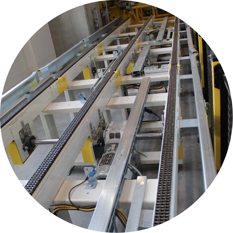 Los transportadores de cadena motorizados se utilizan para la manipulación de productos para su transporte en línea recta y en curva, como alternativa a los transportadores de rodillos. El deslizamiento de las cadenas permite la manipulación de la carga (generalmente un palet) en las diferentes áreas de la planta. Las características físicas de la carga que se transporta afectan a la cantidad de cadenas utilizadas y a sus dimensiones.