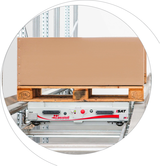 El espacio reducido y la necesidad de una solución que pudiera coexistir con el operario humano llevaron a Cassioli a desarrollar un sistema semiautomático en el que es posible almacenar palés de alta densidad. Cassioli instaló 2 iSat para el almacenamiento semiautomático en los que se pueden trasladar hasta 1554 palés.