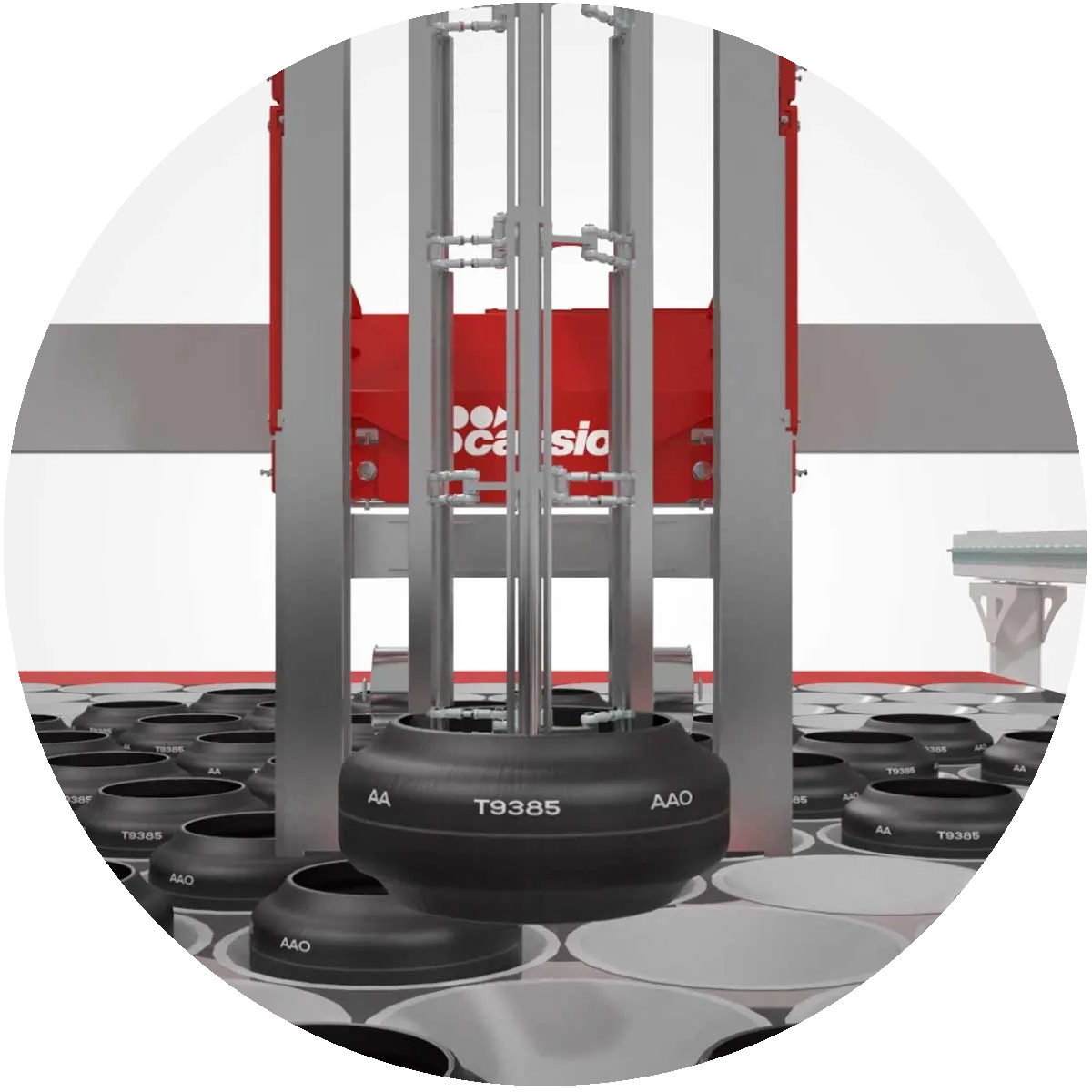 Con esta solución es posible aprovechar el espacio disponible encima de las máquinas de construcción de caucho, no necesitando otras áreas de almacenamiento de la fábrica y reduciendo al máximo el manejo de Green Tire. El sistema Gantry recoge los neumáticos directamente de los transportadores que salen de las máquinas de construcción y los ubica en soportes fijos y perfilados, a la espera de que sean llamados para la salida hacia el área de Vulcanización.