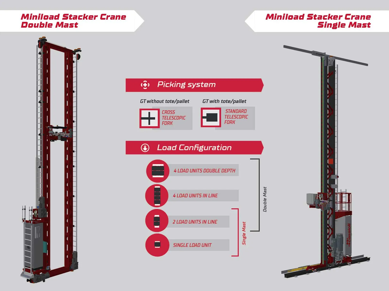 De las cuatro tecnologías de almacén posibles enumeradas anteriormente, el transelevador es la solución más común en terrenos nuevos y donde no hay problemas de espacio entre la maquinaria existente. Cassioli ofrece a sus clientes dos tipos de transelevadores: monocolumna y bicolumna, para cumplir con las diferentes necesidades de caudal y lógica de sujeción a las prensas del cliente. Para cada tipo de transelevador se dispone de diferentes configuraciones de carga. Los transelevadores pueden mover hasta cuatro neumáticos al mismo tiempo; cada horquilla, sin embargo, puede ser independiente de las demás, para garantizar, si es necesario, la máxima flexibilidad del lote uno.