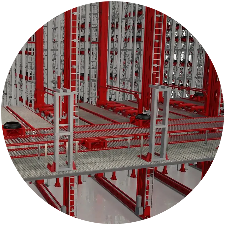 El almacén automático Cassioli con transelevador es un sistema completamente personalizable, que permite disponer los Green Tires según las necesidades específicas del cliente, en términos de espacio disponible, capacidad y flujos. El almacén para Green Tire con transelevador es la solución más habitual en greenfields y donde no existen problemas de espacio entre la maquinaria existente. Para cumplir con los diferentes requisitos de flujo y lógica de enclavamiento de las prensas, Cassioli ha diseñado dos tipos de transelevadores: de una y de dos columnas. Para cada uno de ellos se dispone de diferentes configuraciones de carga. Los transelevadores pueden mover hasta cuatro neumáticos al mismo tiempo; cada horquilla, sin embargo, puede ser independiente de las demás, para garantizar, si es necesario, la máxima flexibilidad del lote uno. Dentro del almacén automático existe la posibilidad de almacenar los Green Tires con o sin tote/palet: en el primer caso, el transelevador realizará el picking con una horquilla telescópica estándar, mientras que en ausencia del tote, el transelevador se configurará con horquilla transversal telescópica.