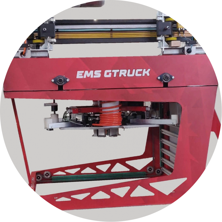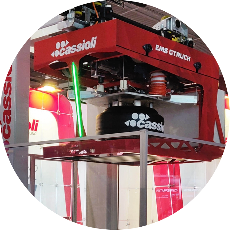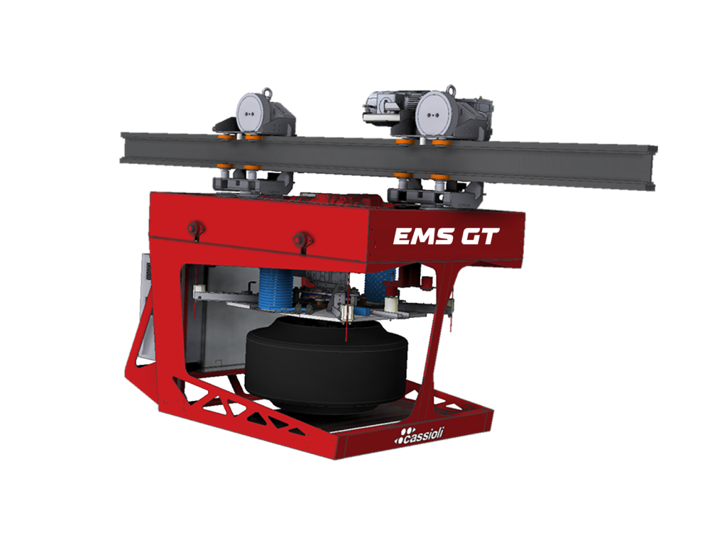 El EMS es el sistema de transferencia monorraíl para la manipulación de neumáticos ecológicos, en las instalaciones de producción de neumáticos, que se desliza a lo largo de un riel suspendido. El EMS se utiliza generalmente para asegurar el flujo continuo de neumáticos ecológicos desde las TBM (Tire Building Machine) a un buffer y desde el buffer a las prensas de polimerización. Las lanzaderas EMS operan por encima de las máquinas, dejando libre el área del piso: esto permite a los operadores y al personal de mantenimiento acceder a las prensas sin problemas. El nuevo concepto de riel especial de aluminio permite al EMS Cassioli alcanzar unas altas prestaciones manteniendo una gran fiabilidad y estabilidad de todo el sistema. La lanzadera es capaz de gestionar de forma totalmente automática varios tamaños de neumáticos y de interactuar con diferentes tipos de prensas.